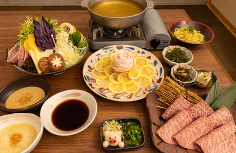 沖縄在来アグー豚の希少な純血種・A5ランク和牛を極上の出汁にくぐらせて愉しむしゃぶしゃぶが絶品です。
